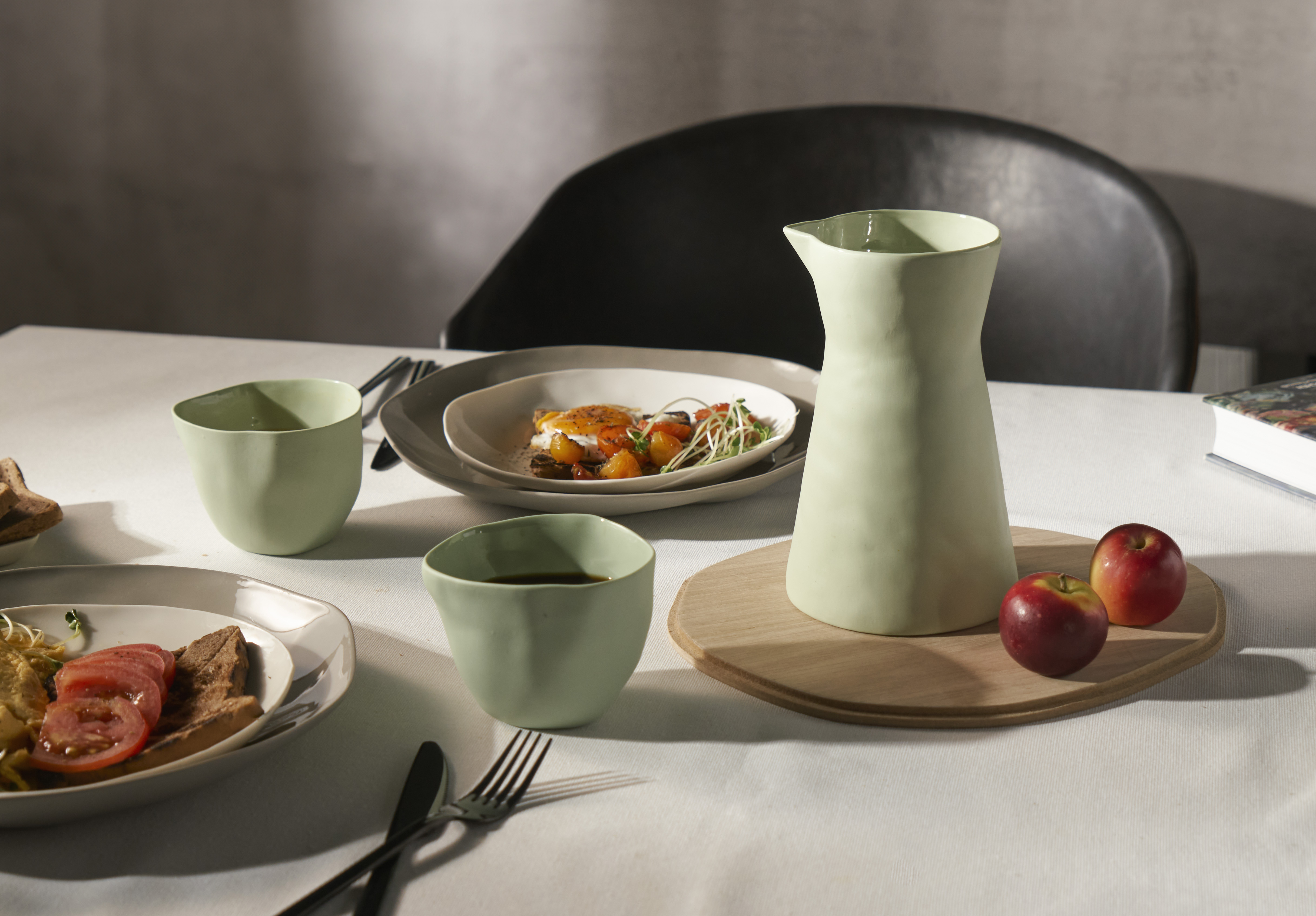 A water pitcher with glossy finish inside, matte rough outside and pastel color. Can also be used as a vase to decorate your table.