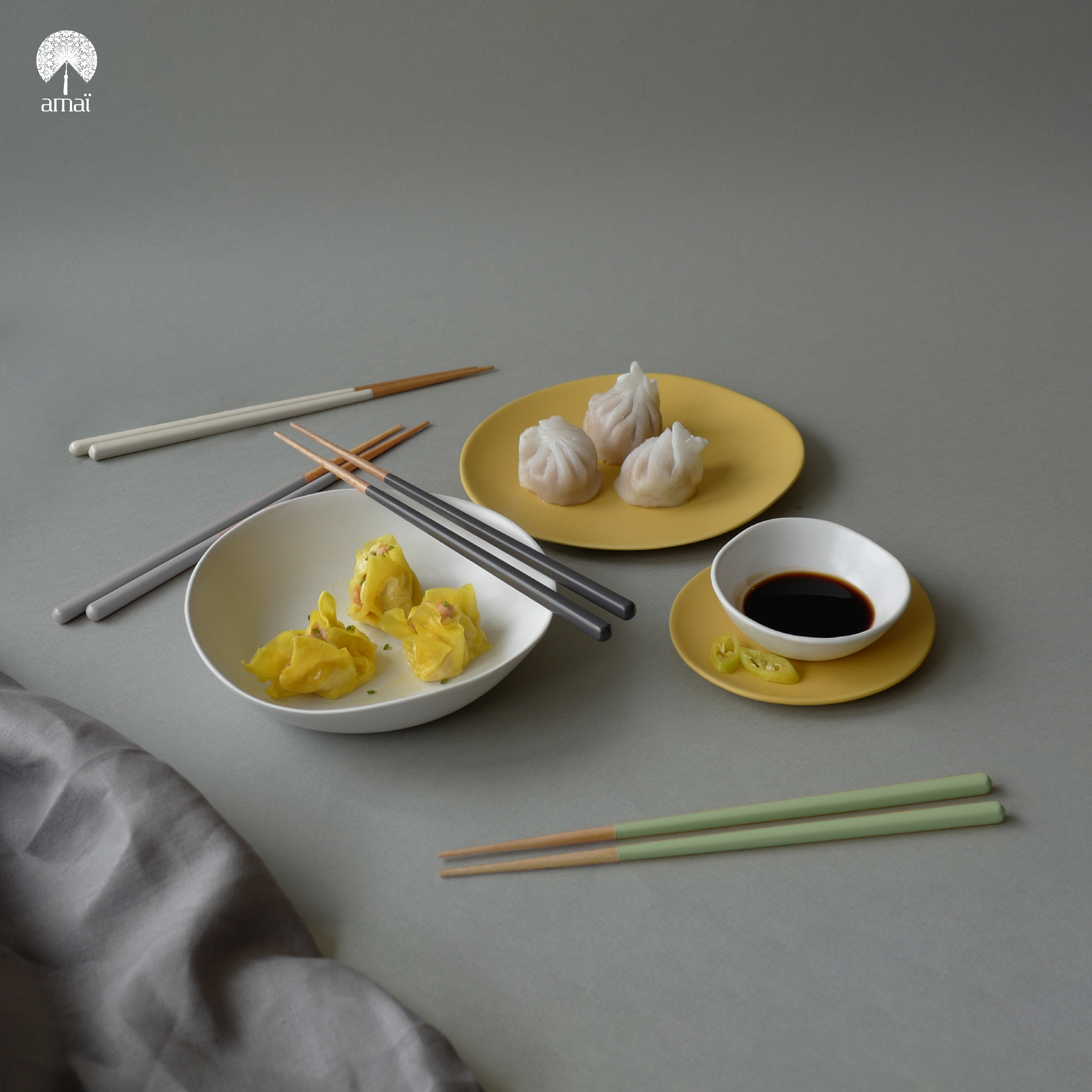 An Asian wooden chopsticks with modern design. Their handling end is coated with lacquer. Available in lovely pastel tones which fit in perfectly to amai palette. Grabbing end is coated with water-proof layer, matte finnish to help better food gripping.