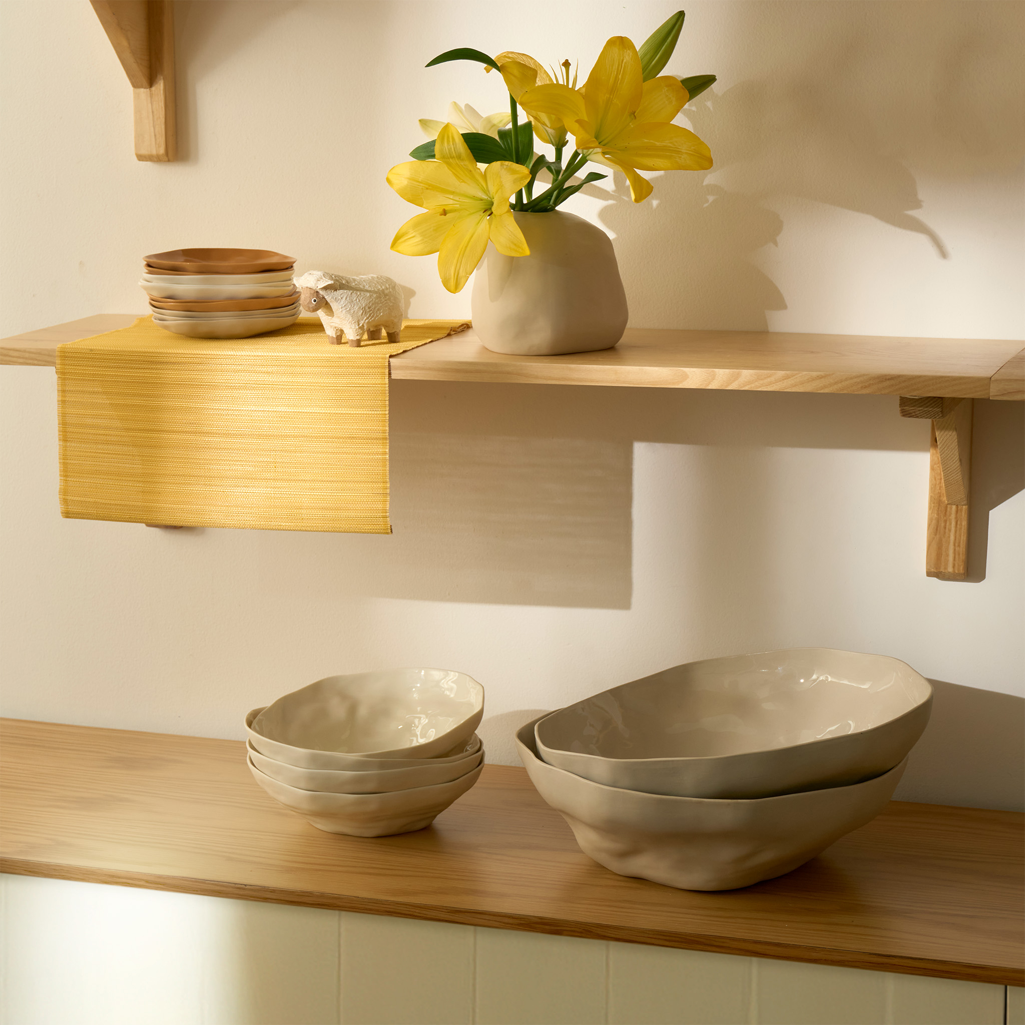 Stacked, stored, and always in reach. Table necessities sit pretty on open kitchen shelves and ready for your next home-cooked meal.